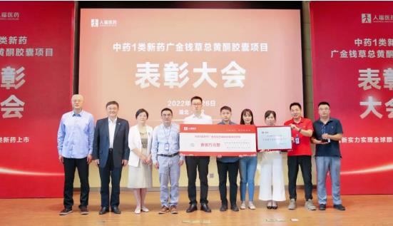 集團副總裁于群代表總裁辦宣讀《人福醫(yī)藥集團關于中藥創(chuàng)新藥廣金錢草總黃酮膠囊項目表彰的決定》:人福醫(yī)藥自主研發(fā)的1.2類中藥創(chuàng)新藥廣金錢草總黃酮膠囊獲國家藥品監(jiān)督管理局上市批準,成為全球首創(chuàng)的防治尿結石癥中藥新藥,也是公司繼1類化藥苯磺酸瑞馬唑侖、磷丙泊酚二鈉之后,獲批的第3個1類創(chuàng)新藥。經(jīng)集團總裁辦研究決定,授予廣金錢草總黃酮膠囊項目“研發(fā)創(chuàng)新獎”,對項目團隊通報表彰并獎勵人民幣100萬元。