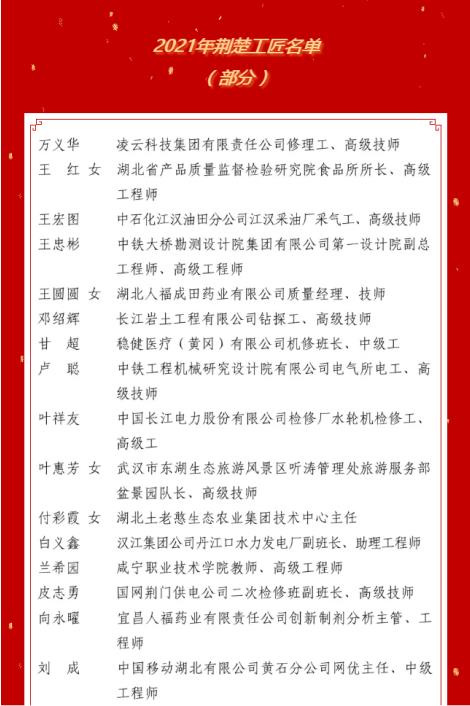 ? ? ?11月10日,在2021年荊楚工匠培育創(chuàng)建工作視頻會(huì)議上,湖北省總工會(huì)公布100位2021年“荊楚工匠”,人福醫(yī)藥集團(tuán)向永曜和王圓圓入選。