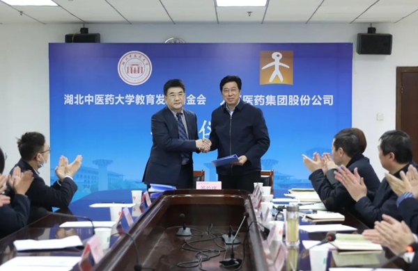武漢人福醫(yī)療管理有限公司董事長曾志敏與湖北中醫(yī)藥大學(xué)副校長、教育發(fā)展基金會副理事長黃必勝簽訂捐贈協(xié)議
